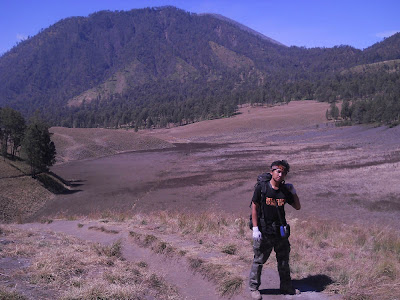 Memang inilah yang harus dilakukan mengingat beratnya medan yang akan kami lalui nanti ( padahal aku belum pernah melewatinya ). Dan akhirnya kami mulai bergerak. Dari Kalimati kami menuju arah timur sedikit, kemudian berbelik ke arah utara dan melewati turunan. Setelah turunan kami mulai masuk hutan kembali sekaligus disambut oleh tanjakan yang cukup terjal. Kondisi medan selain menanjak juga berdebu sehingga kembali kami harus mengencangkan masker kami agar debu tidak masuk ke saluran pernapasan.